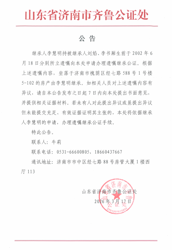 继承人李慧明持被继承人刘焰、李书厢生前于2002年6月18日分别所立遗嘱向本处申请办理遗嘱继承公证。根据上述遗嘱内容,坐落于济南市槐荫区经七路588号1号楼5-102的房产由李慧明继承。如相关人员对上述遗嘱内容有异议,请自本公告发布之日起7日内向本处提出书面意见,并提供相关证据材料。若未有人对此提出异议或虽提出异议但未能提交充足、有效证据证明其主张的,本处将依据继承人李慧明的申请,办理遗嘱继承公证手续。