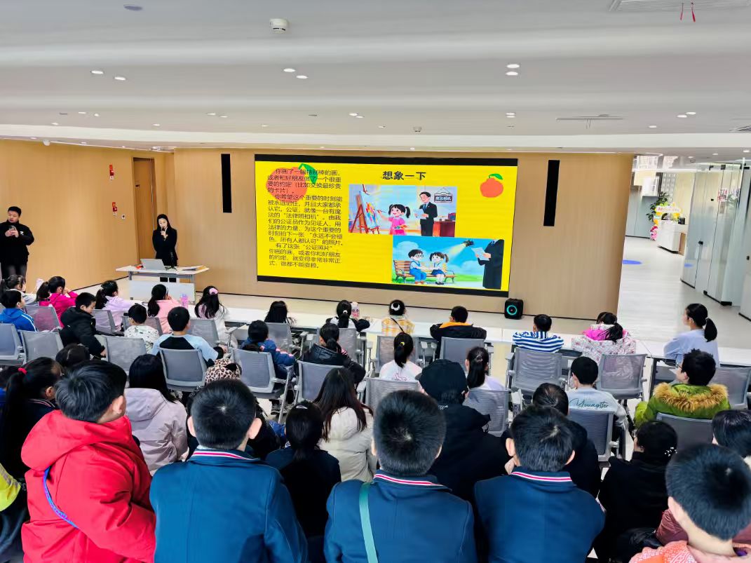 活动伊始,我处主任助理侯雯热情接待了共青团小伙伴们,带领小朋友们参观了齐鲁公证处法务中心办公场所,并详细介绍了齐鲁公证处的发展历程、职能定位及服务领域。随后,在专门设置的“公证小课堂”环节,公证员周相安以通俗易懂的语言,深入浅出地讲解了公证的基本概念、法律效力以及常见公证类型,让小朋友们对公证员这一职业有了更深刻的理解。